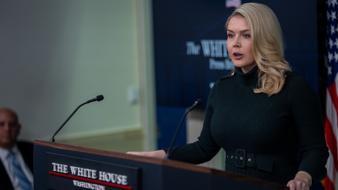 LEAVITT: Okay, everyone sit down, settle down. Any liberal media in here? You’re already wrong and what you write about this is lies. Good? Good.