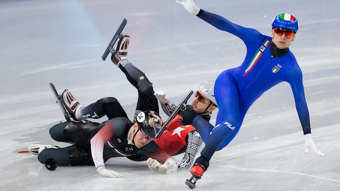 “They’re lying on a tea tray and going head-first down a frozen drainpipe, and that’s entertainment. Speed skating turns into a tangled wreckage of bodies on the first corner. A beautiful figure skating routine collapses to a mess of skidding people with bladed feet. It’s A&E on ice.